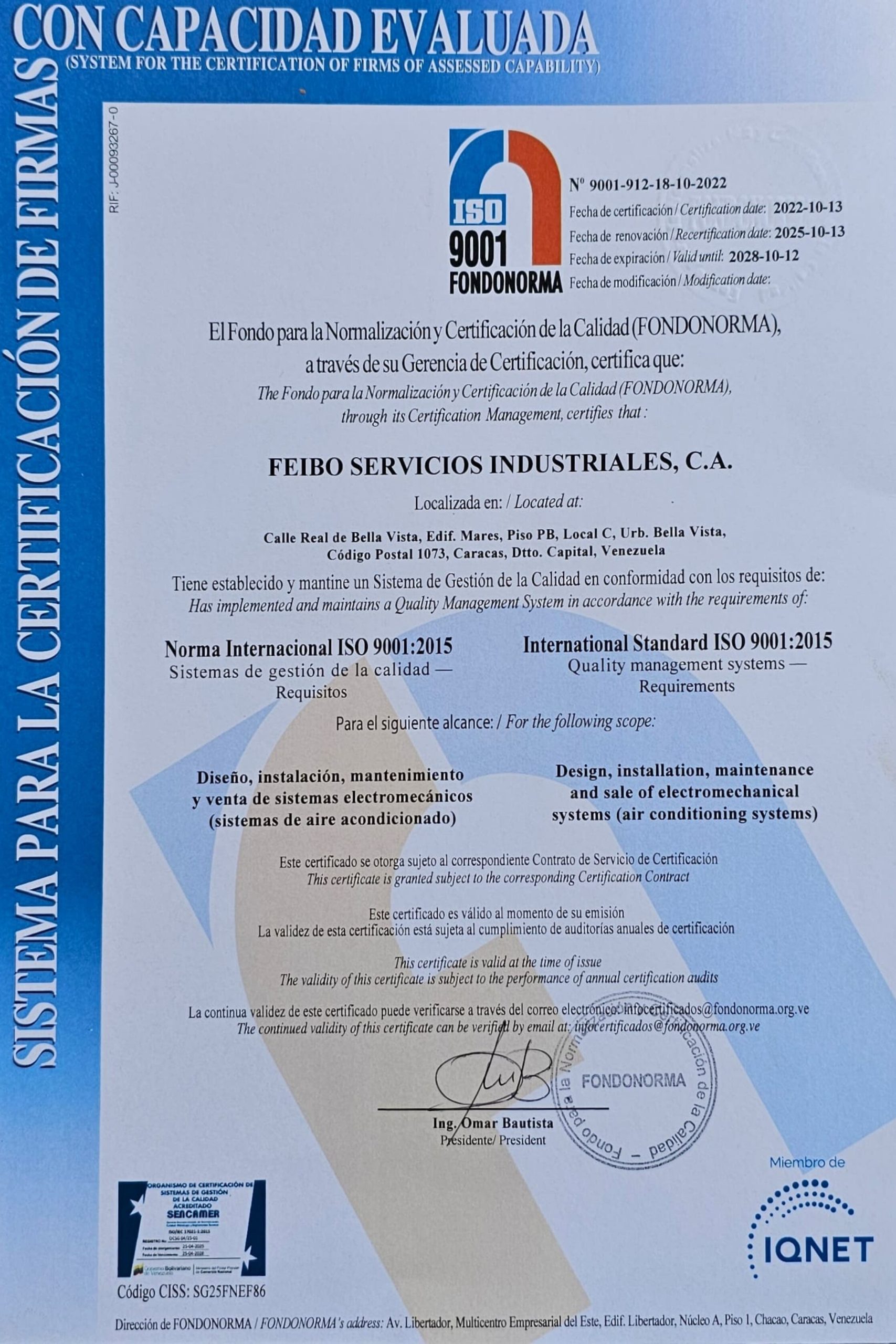 Las certificaciones ISO 9001 otorgadas por FONDONORMA cuentan con la acreditación del Servicio Autónomo Nacional de Normalización, Calidad, Metrología y Reglamentos Técnicos, SENCAMER.
